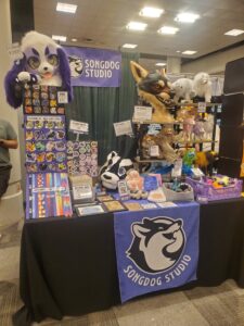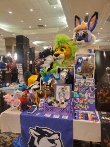 The table images are of my dealer table at Texas Furry Siesta 2025 and my artist alley table at Texas Furry Fiesta 2025.